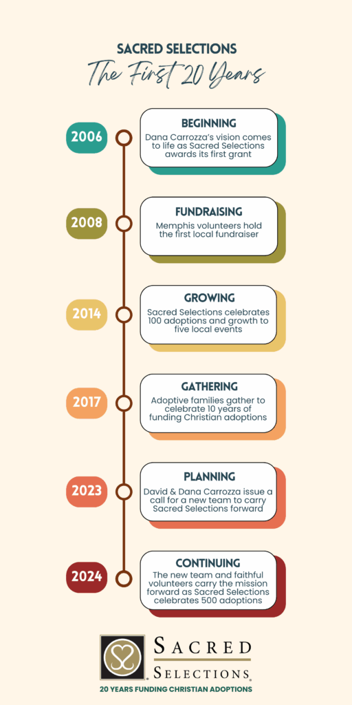 Established in 2006, this year marks the 20th year of Sacred Selections and the work of funding Christian adoptions. Each of the moments below – and all the days in between – stand as testament to God’s enduring love. The work, prayers, and faithful love of so many individuals have come together in kingdom service, providing homes for children in need. Thank you for joining in the journey and putting your trust in God and His enduring love.